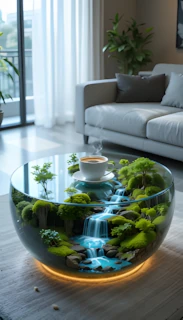 A futuristic round glass coffee table resembling a floating island with a waterfall. Inside the transparent sphere, a tiny lush green island is suspended in mid-air, with a waterfall pouring down into a glowing blue lake below. The water swirls with gentle ripples, and small vines hang from the island’s rocky edges. The lighting inside the table casts magical reflections on the glass, creating an ethereal floating effect. A steaming cup of cappuccino sits on top, enhancing the surreal, dreamlike ambiance of the room.
