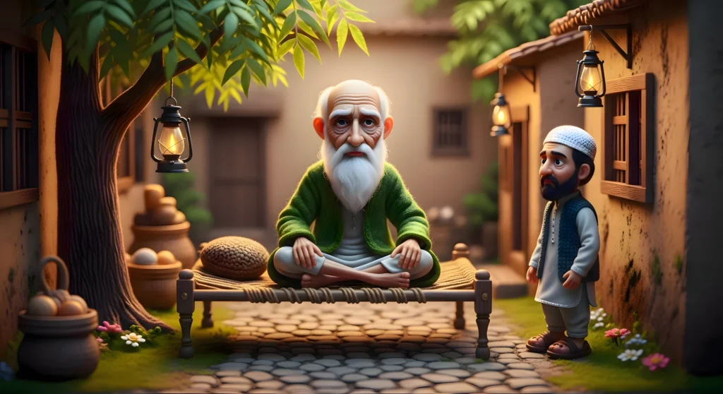 “A 100-year-old Allah ka Wali, extreamly thin and physically weak, fragile body, extreamly long pure white beard, wearing a green darvesh-style Islamic robe, noor-filled wrinkled face, deeply calm and spiritually powerful eyes, a silent aura of divine wisdom and mercy surrounding him”