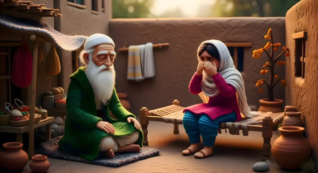 • Background should support the story’s theme (e.g., village, mosque, street, field), but fully woolen/fiber style